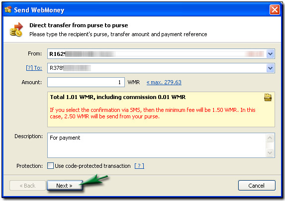 نرمافزار ابزار کلاسیک را باز کنید و به اکانت خود وارد شوید. چند لحظه صبر کنید تا به مرکز تاییدات وصل شوید. روی کیف پول مورد نظر کلیک راست نمایید و send WM را انتخاب کنید. شماره کیف پول دریافت کننده پول را وارد کرده روی Next کلیکک کنید.
